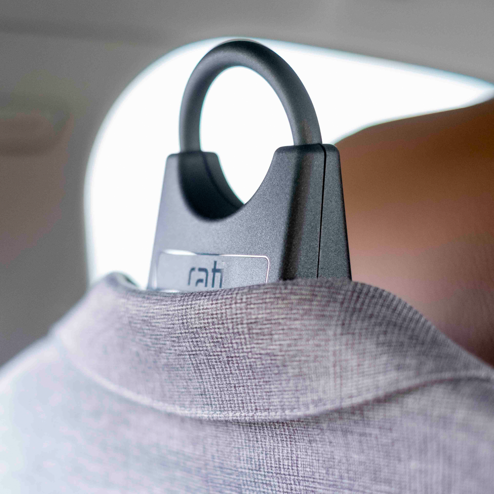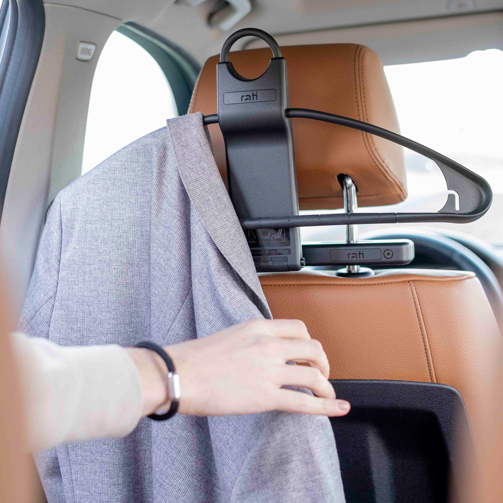 Clothes or jackets can be placed on the Rati hanger at home, taken to the car, and attached to the rack in one easy movement before leaving.